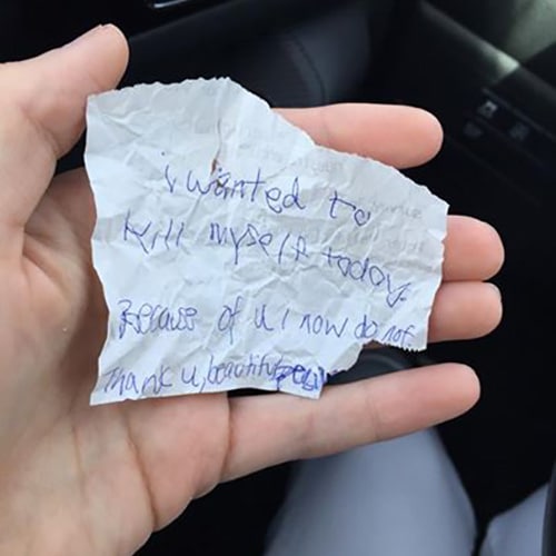 “Dziś chciałem zakończyć moje życie samobójstwem. Ale dzięki tobie, będę żył i postaram się naprawić wszystko. Dziękuję ci, jesteś wspaniałą osobą.”