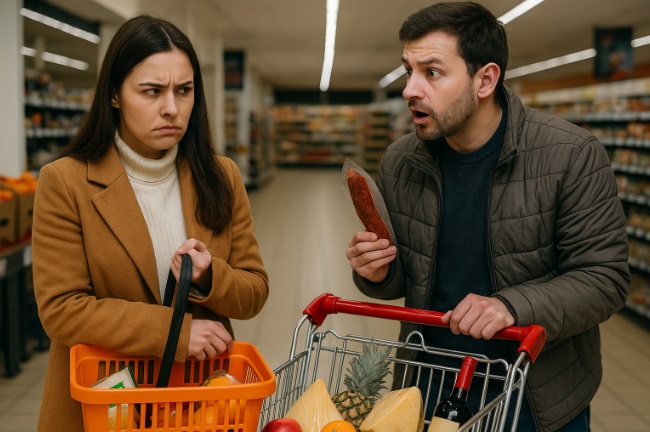 Myślę: ok. Ale potem… zaczęło się zbieranie „drobiazgów”: do wózka wrzucił koniak marki premium, suchą kiełbasę z drogiej półki, ser szwajcarski, słoik kawioru, wędzonego łososia i świeżego ananasa.
