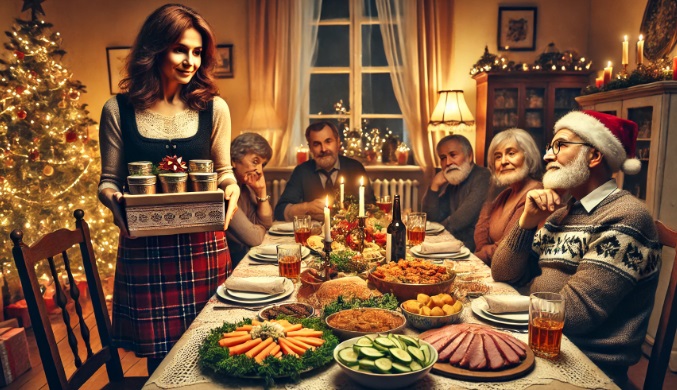 Kiedy goście zasiedli do stołu i zaczęli degustować przygotowane dania, do drzwi zapukała Maria. Wręczyła prezent, złożyła życzenia zdrowia, po czym, ku zaskoczeniu wszystkich, wyciągnęła z torby puste pojemniki.